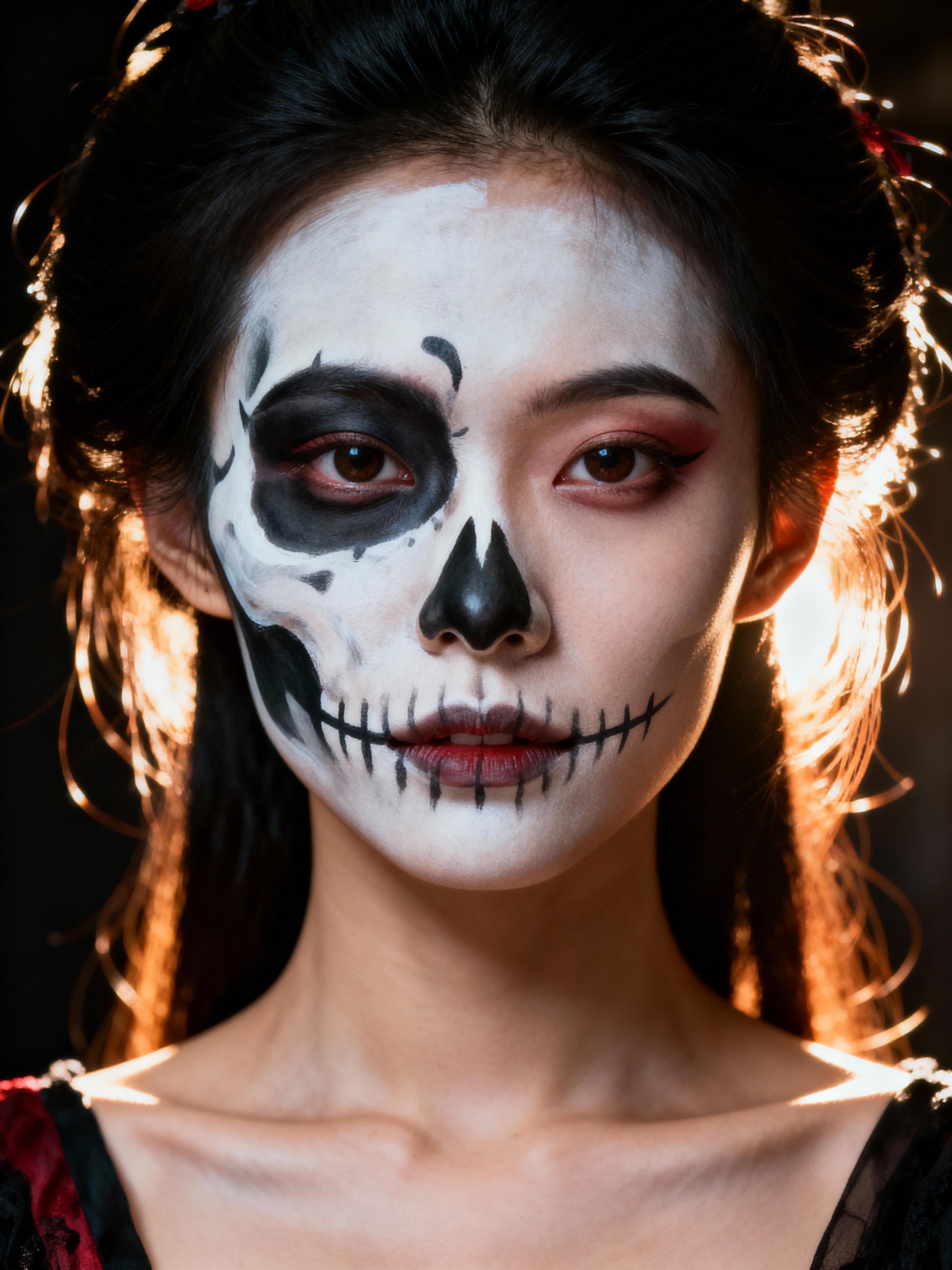 a model with face beautifully painted in half-skull calavera style , capturing the duality of life and death that defines this important cultural celebration