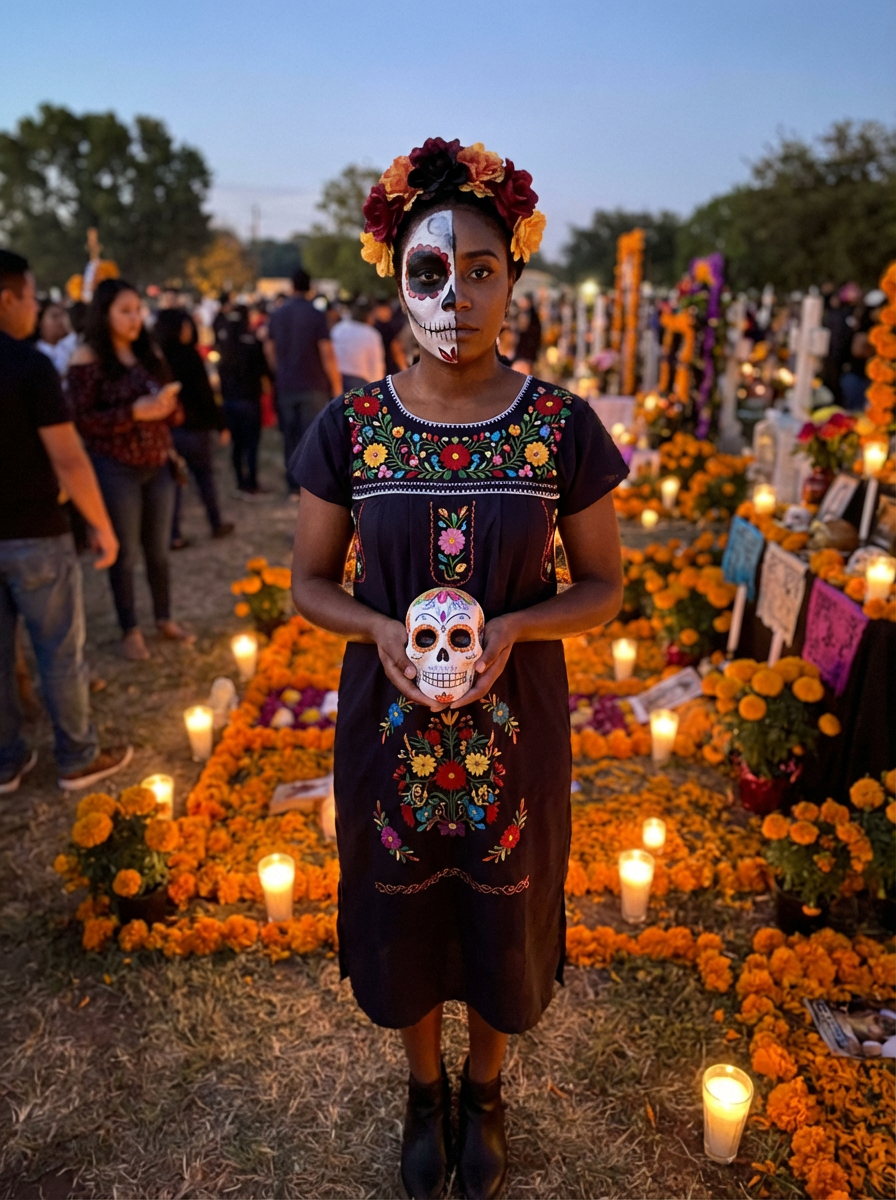 a model with face beautifully painted in half-skull calavera style , capturing the duality of life and death that defines this important cultural celebration