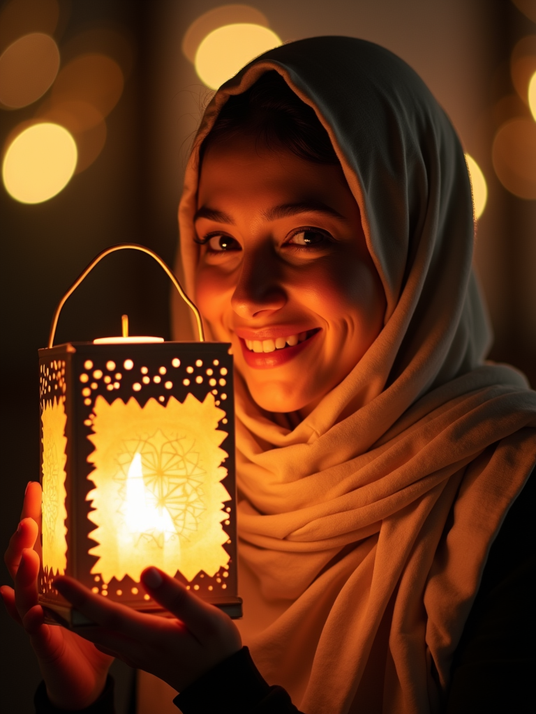a model with face framed by a beautiful hijab, illuminated by soft lantern light , capturing the happiness that defines this blessed holiday