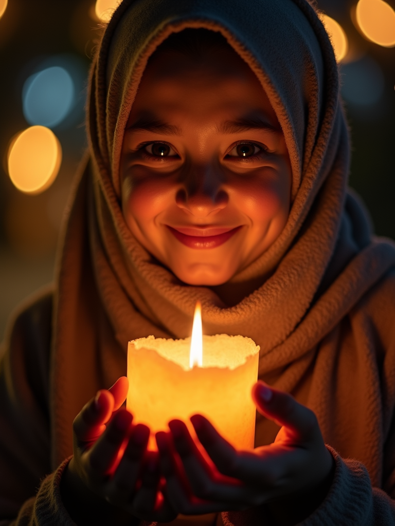 a model with face framed by a beautiful hijab, illuminated by soft lantern light , capturing the happiness that defines this blessed holiday