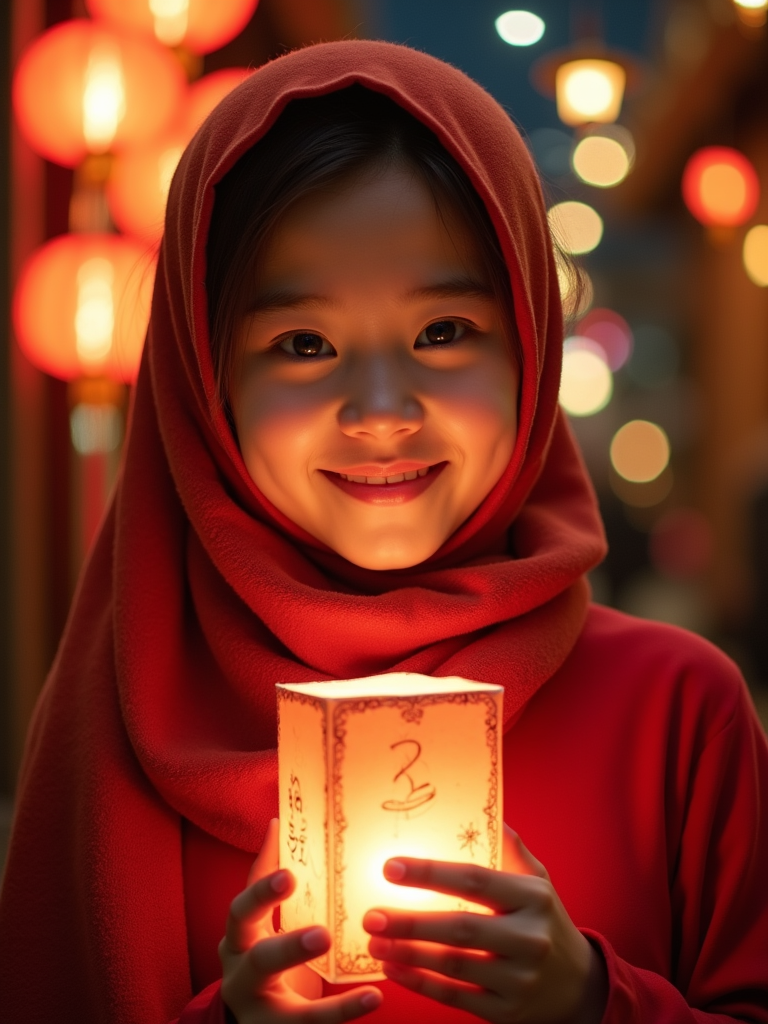 a model with face framed by a beautiful hijab, illuminated by soft lantern light , capturing the happiness that defines this blessed holiday