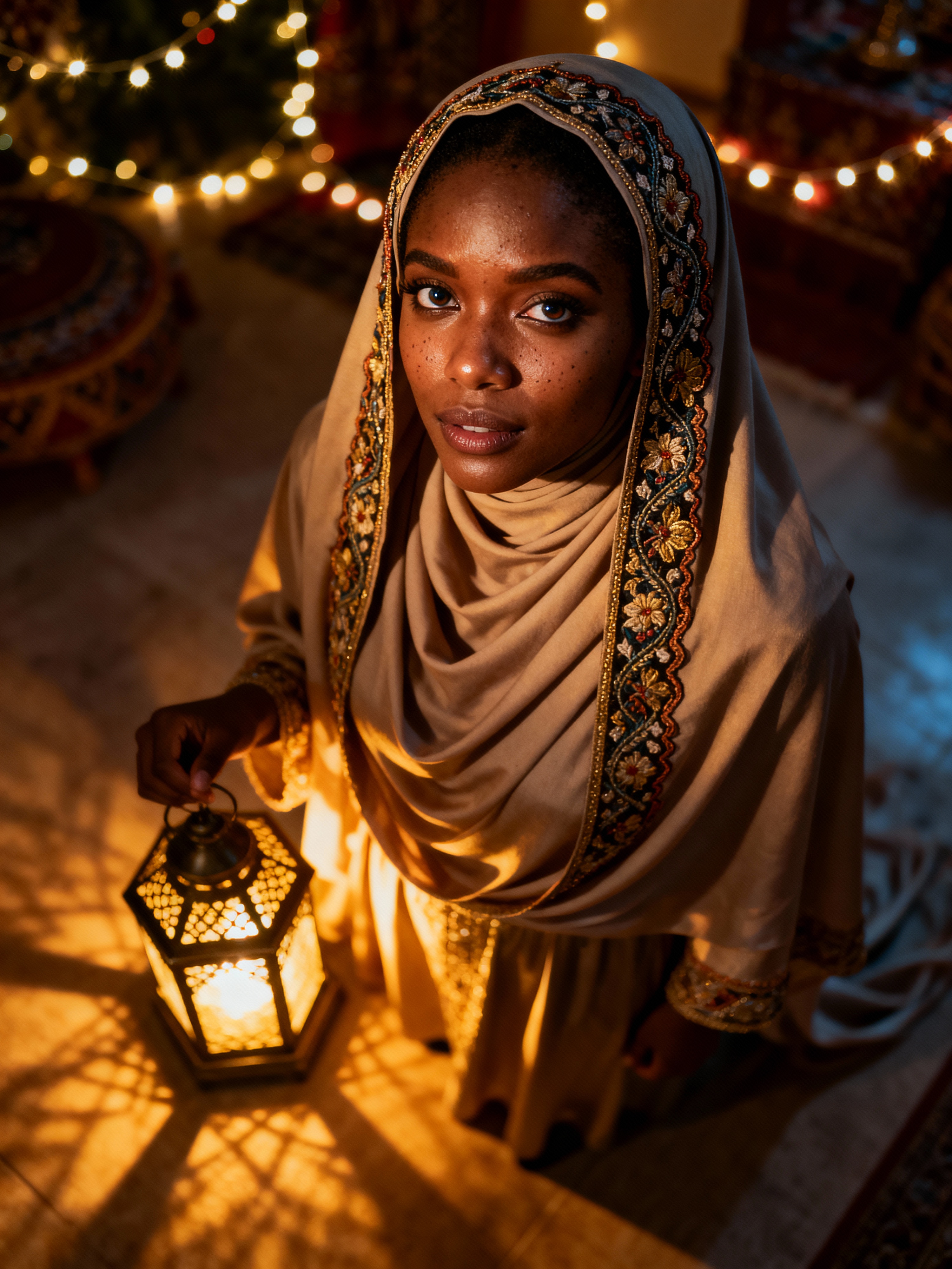 a model with face framed by a beautiful hijab, illuminated by soft lantern light , capturing the happiness that defines this blessed holiday
