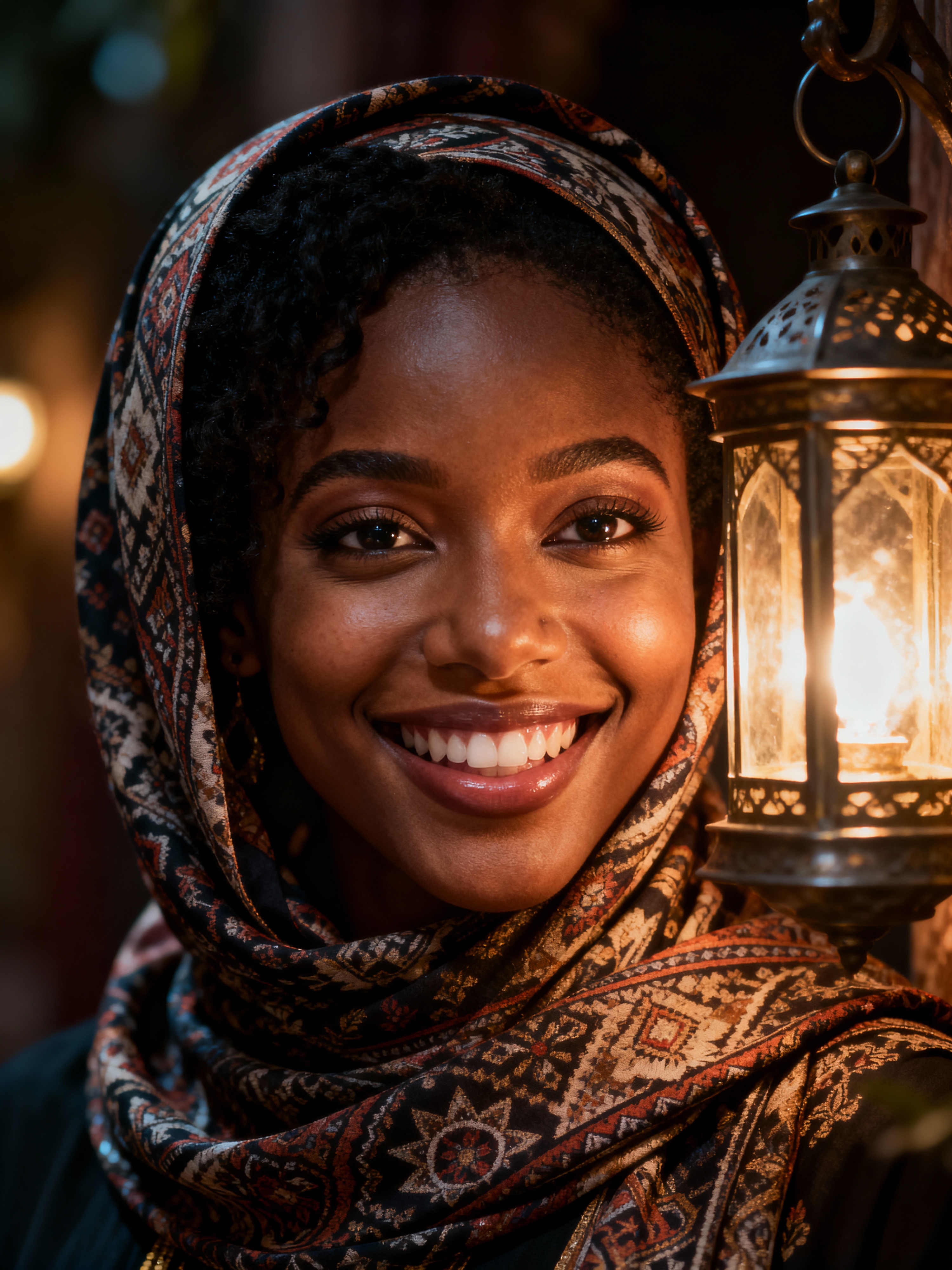 a model with face framed by a beautiful hijab, illuminated by soft lantern light , capturing the happiness that defines this blessed holiday