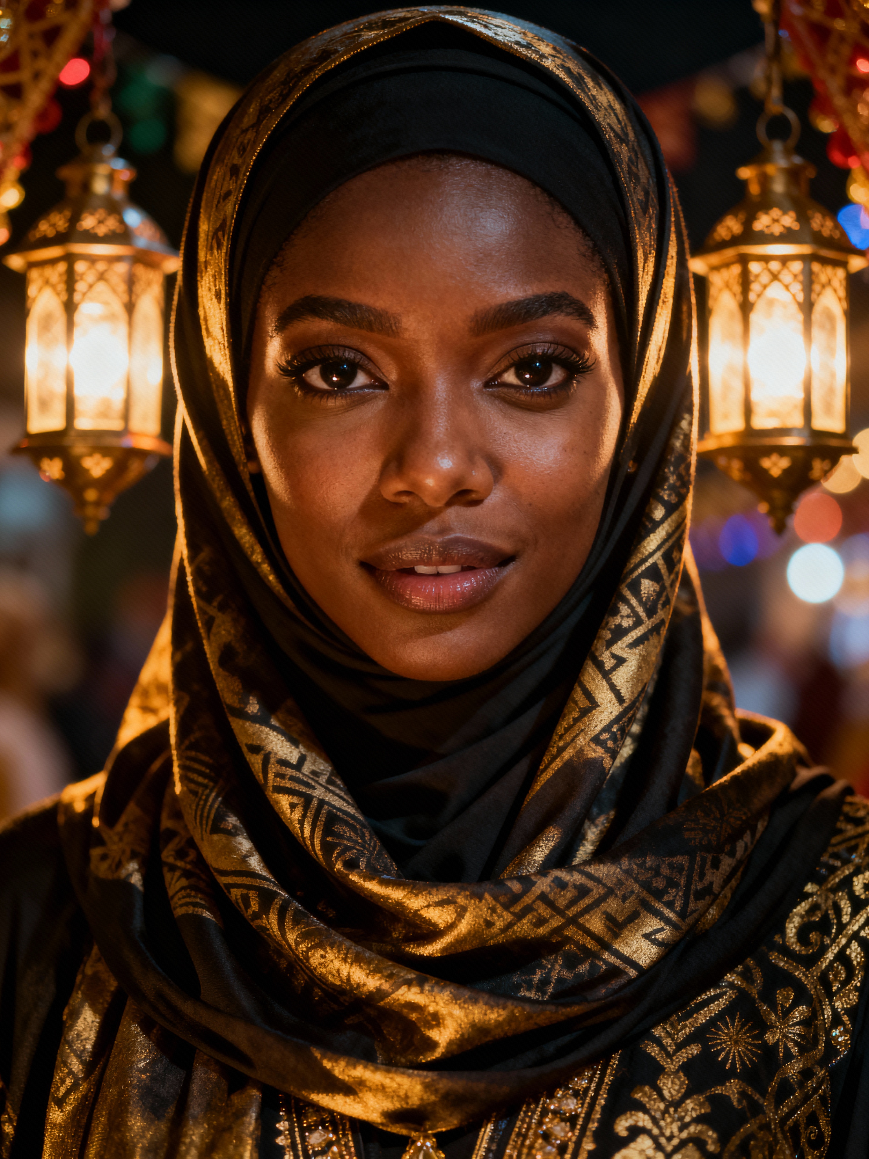a model with face framed by a beautiful hijab, illuminated by soft lantern light , capturing the happiness that defines this blessed holiday