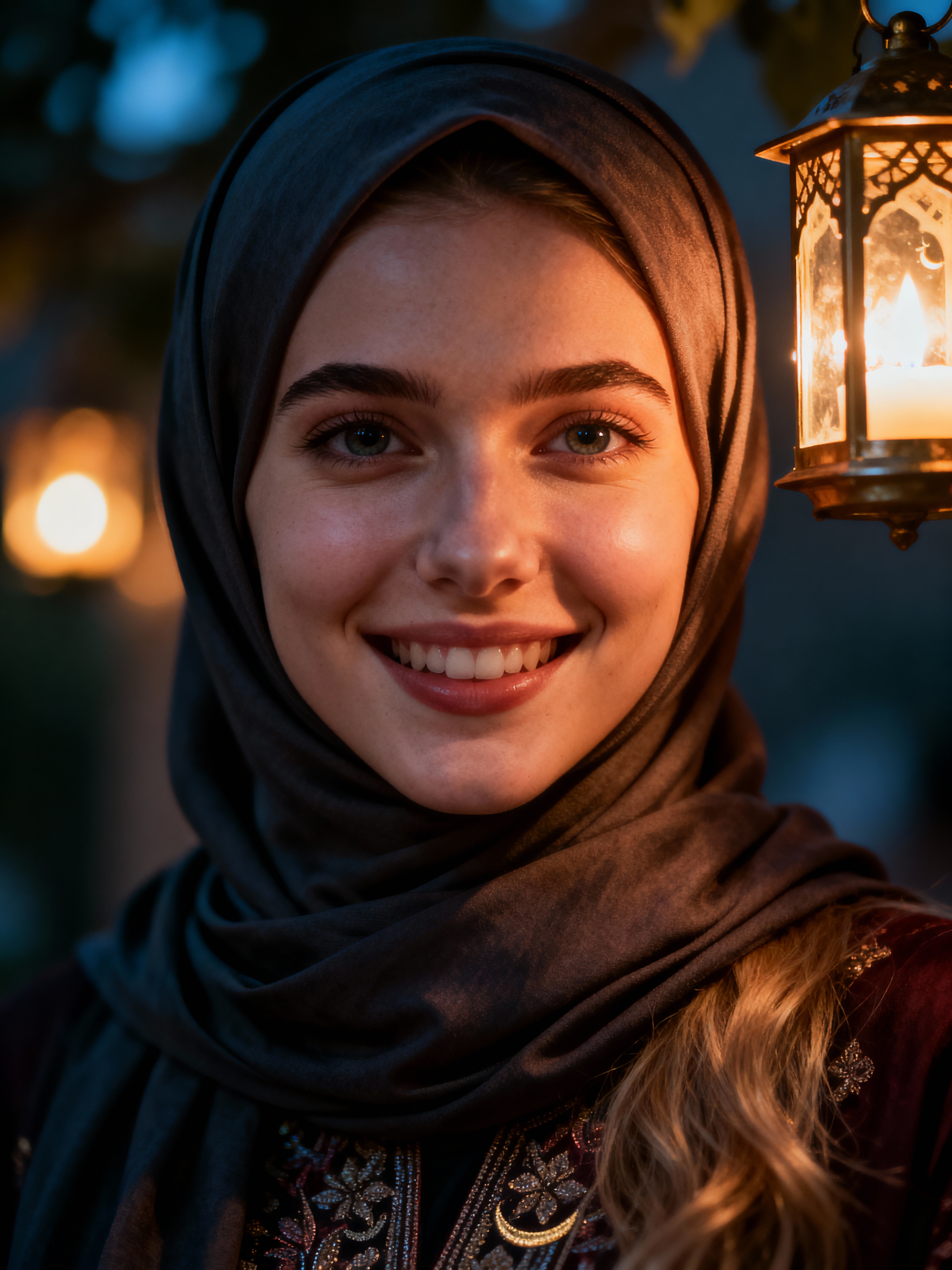 a model with face framed by a beautiful hijab, illuminated by soft lantern light , capturing the happiness that defines this blessed holiday