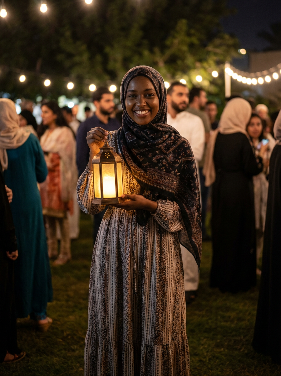 a model with face framed by a beautiful hijab, illuminated by soft lantern light , capturing the happiness that defines this blessed holiday
