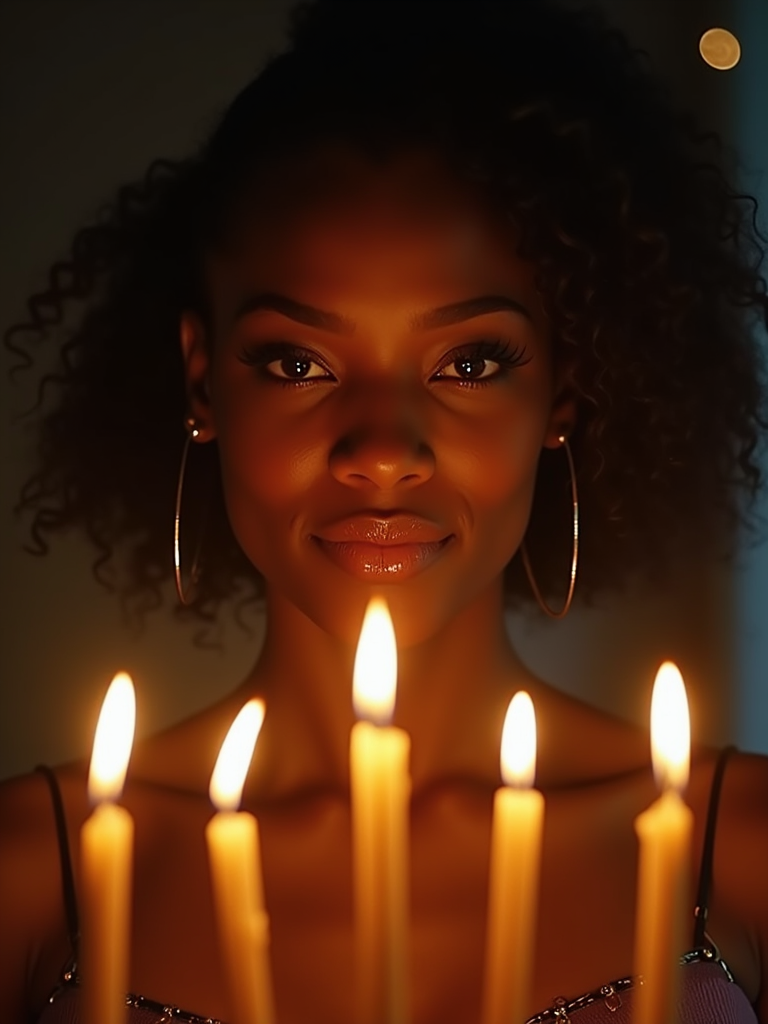 a model with face illuminated by the warm glow of menorah candles , capturing the miracle of light that defines this important holiday