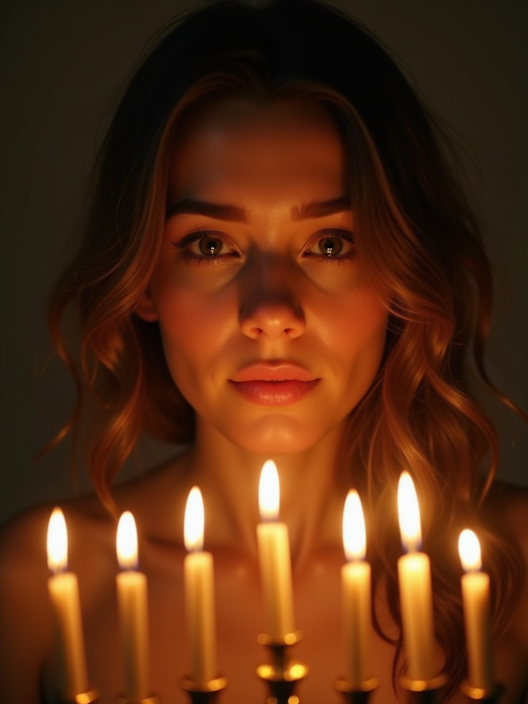a model with face illuminated by the warm glow of menorah candles , capturing the miracle of light that defines this important holiday