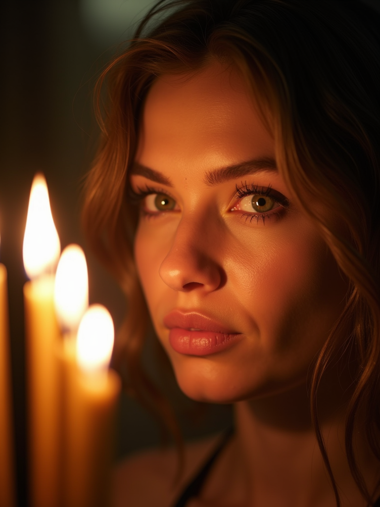 a model with face illuminated by the warm glow of menorah candles , capturing the miracle of light that defines this important holiday
