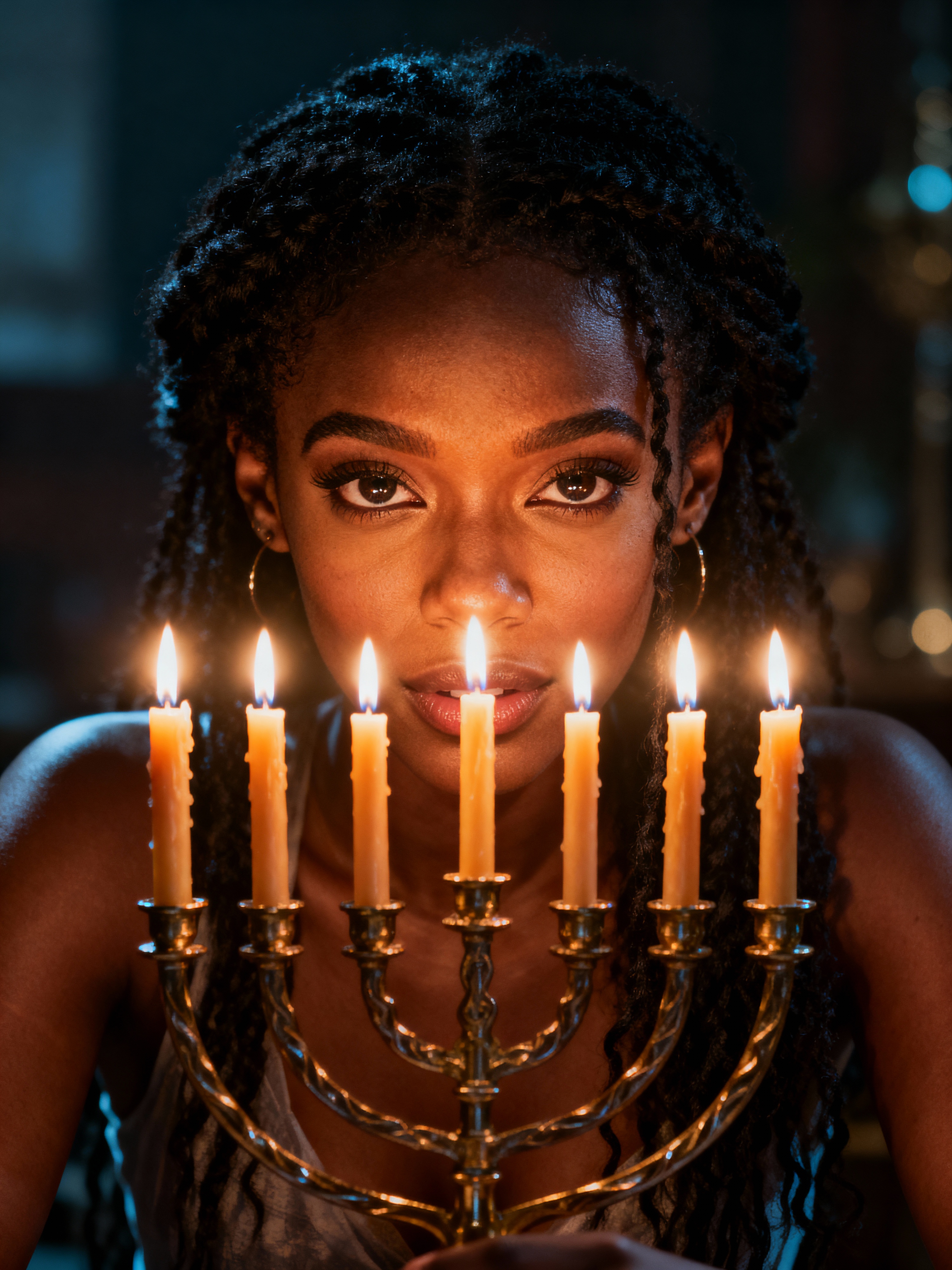 a model with face illuminated by the warm glow of menorah candles , capturing the miracle of light that defines this important holiday