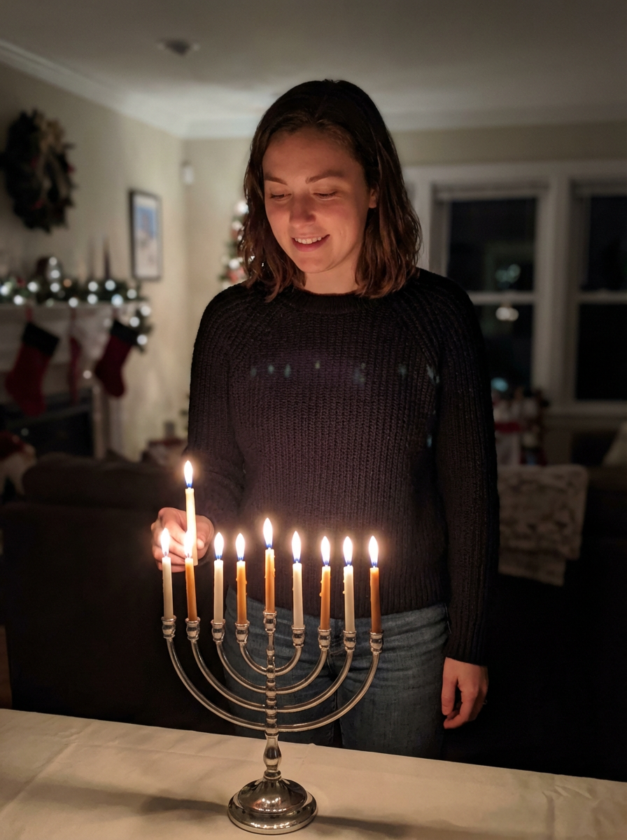a model with face illuminated by the warm glow of menorah candles , capturing the miracle of light that defines this important holiday