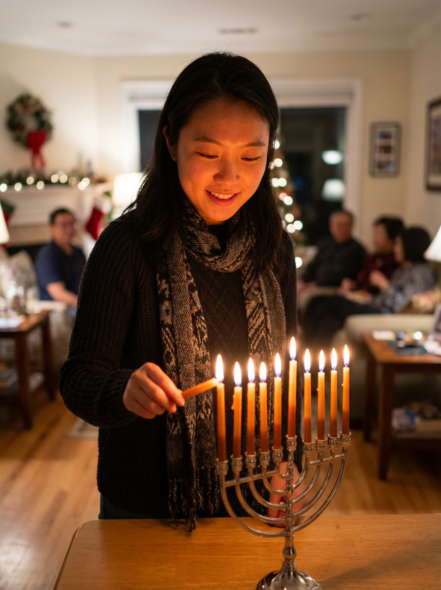 a model with face illuminated by the warm glow of menorah candles , capturing the miracle of light that defines this important holiday