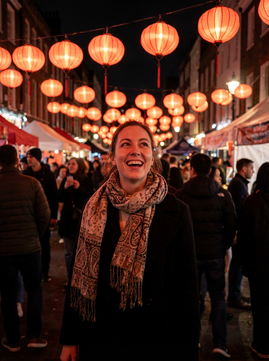 a model with face illuminated by the warm glow of red lanterns , capturing the excitement that defines this important cultural celebration
