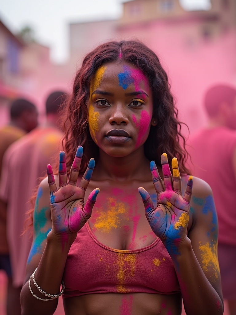 a model with hands and face painted with intricate Holi color patterns , standing out in the festival crowd with vibrant color clouds surrounding them
