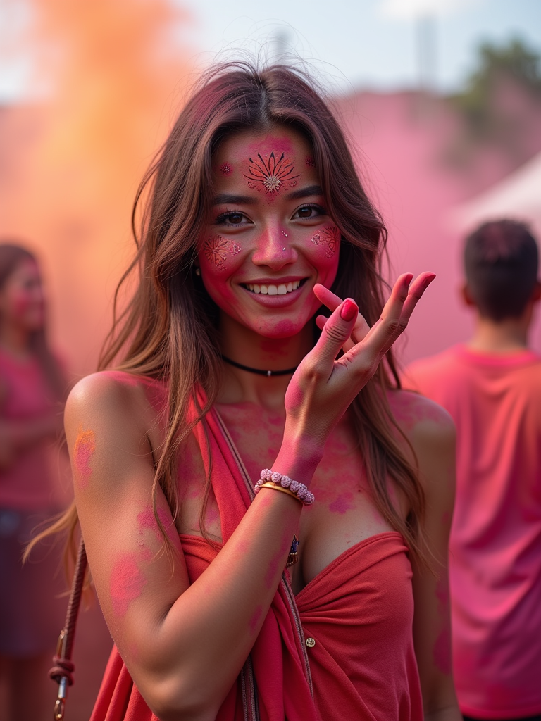 a model with hands and face painted with intricate Holi color patterns , standing out in the festival crowd with vibrant color clouds surrounding them