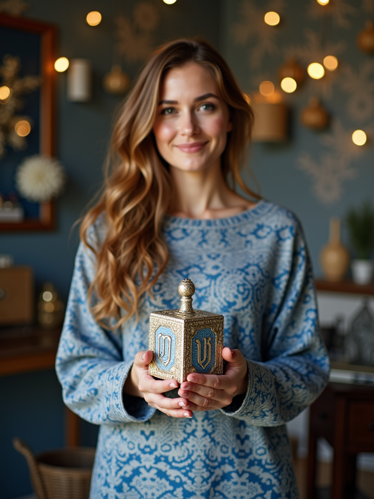 a model with hands holding a beautifully decorated dreidel , standing out in a beautifully decorated home with blue and silver ornaments and Hebrew calligraphy
