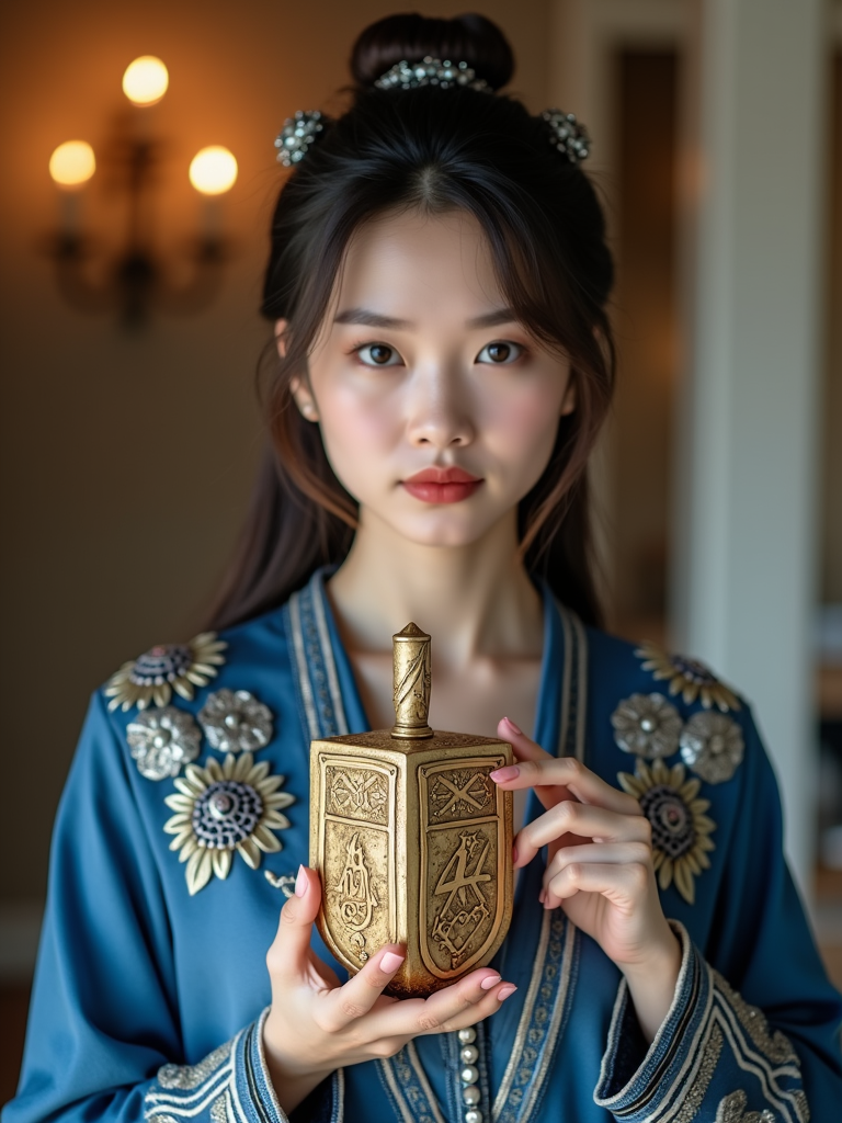 a model with hands holding a beautifully decorated dreidel , standing out in a beautifully decorated home with blue and silver ornaments and Hebrew calligraphy