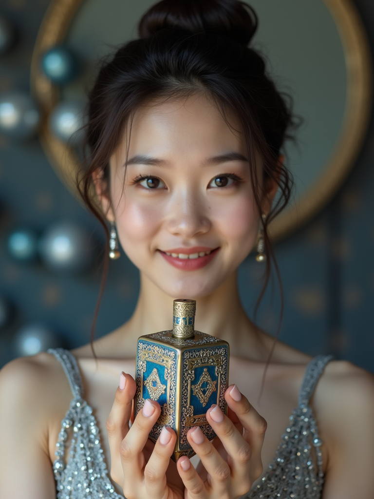 a model with hands holding a beautifully decorated dreidel , standing out in a beautifully decorated home with blue and silver ornaments and Hebrew calligraphy