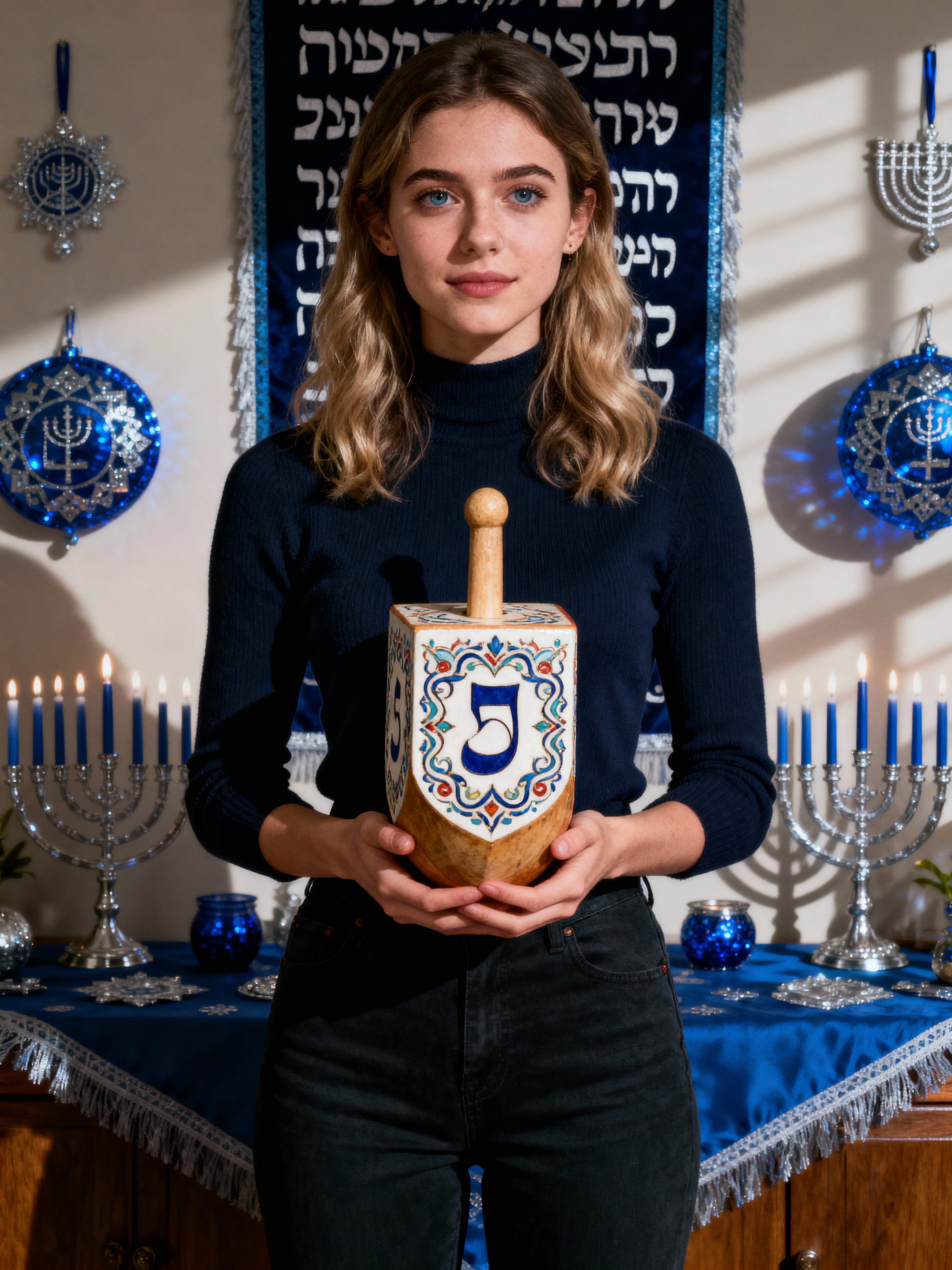a model with hands holding a beautifully decorated dreidel , standing out in a beautifully decorated home with blue and silver ornaments and Hebrew calligraphy