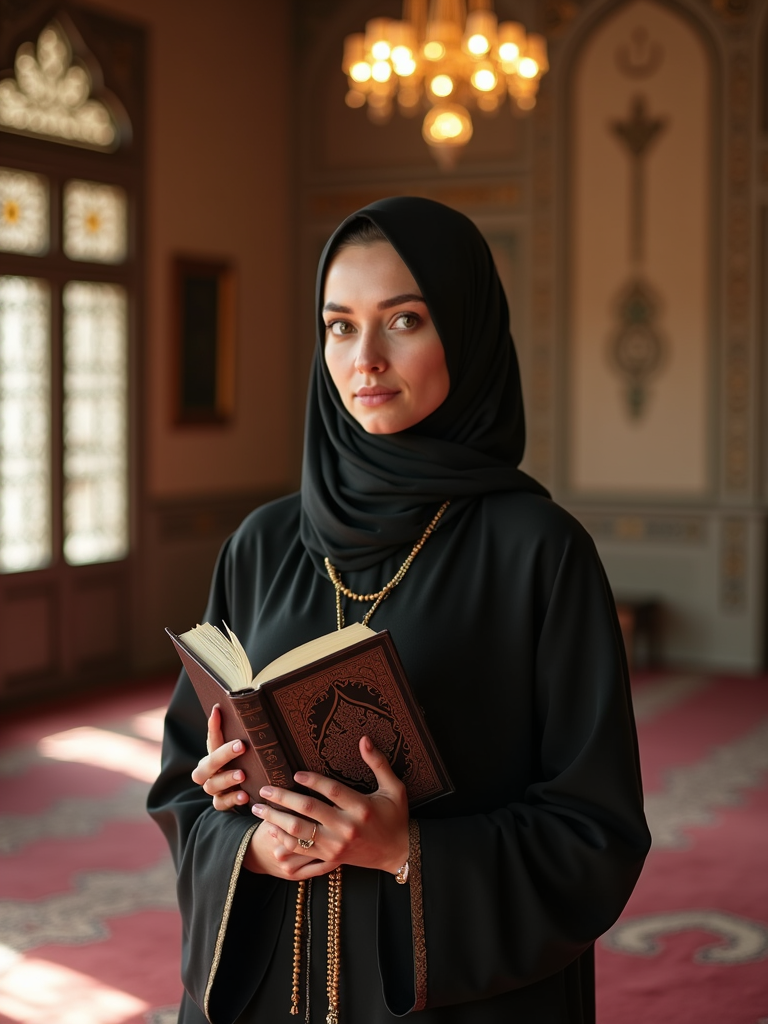 a model with hands holding a Quran and prayer beads , standing out in a beautifully decorated prayer space with soft lighting and Islamic calligraphy