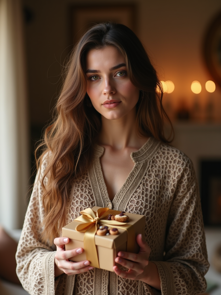 a model with hands holding Eid gifts and sweets , standing out in a beautifully decorated home with soft lighting and Islamic calligraphy