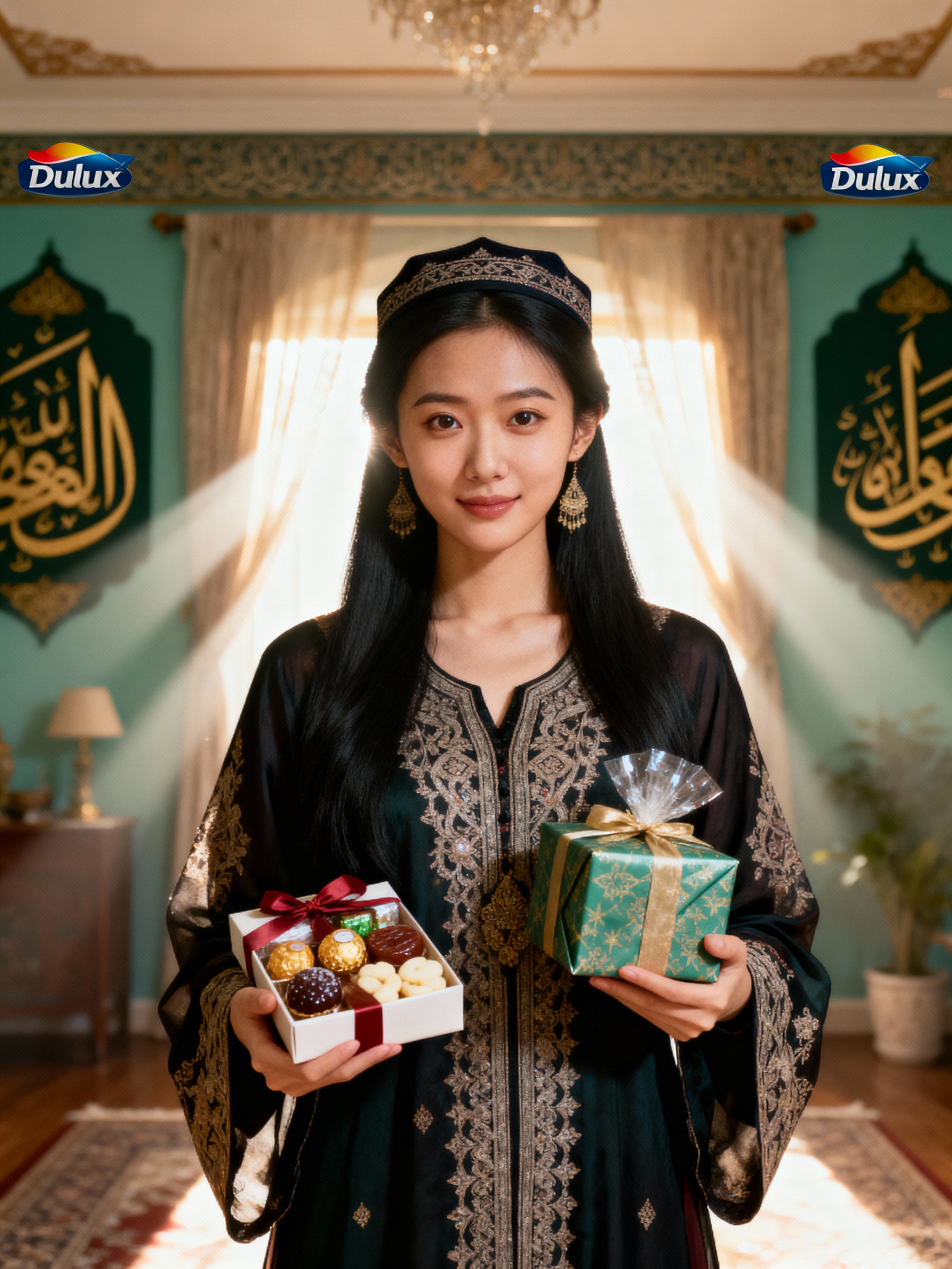 a model with hands holding Eid gifts and sweets , standing out in a beautifully decorated home with soft lighting and Islamic calligraphy