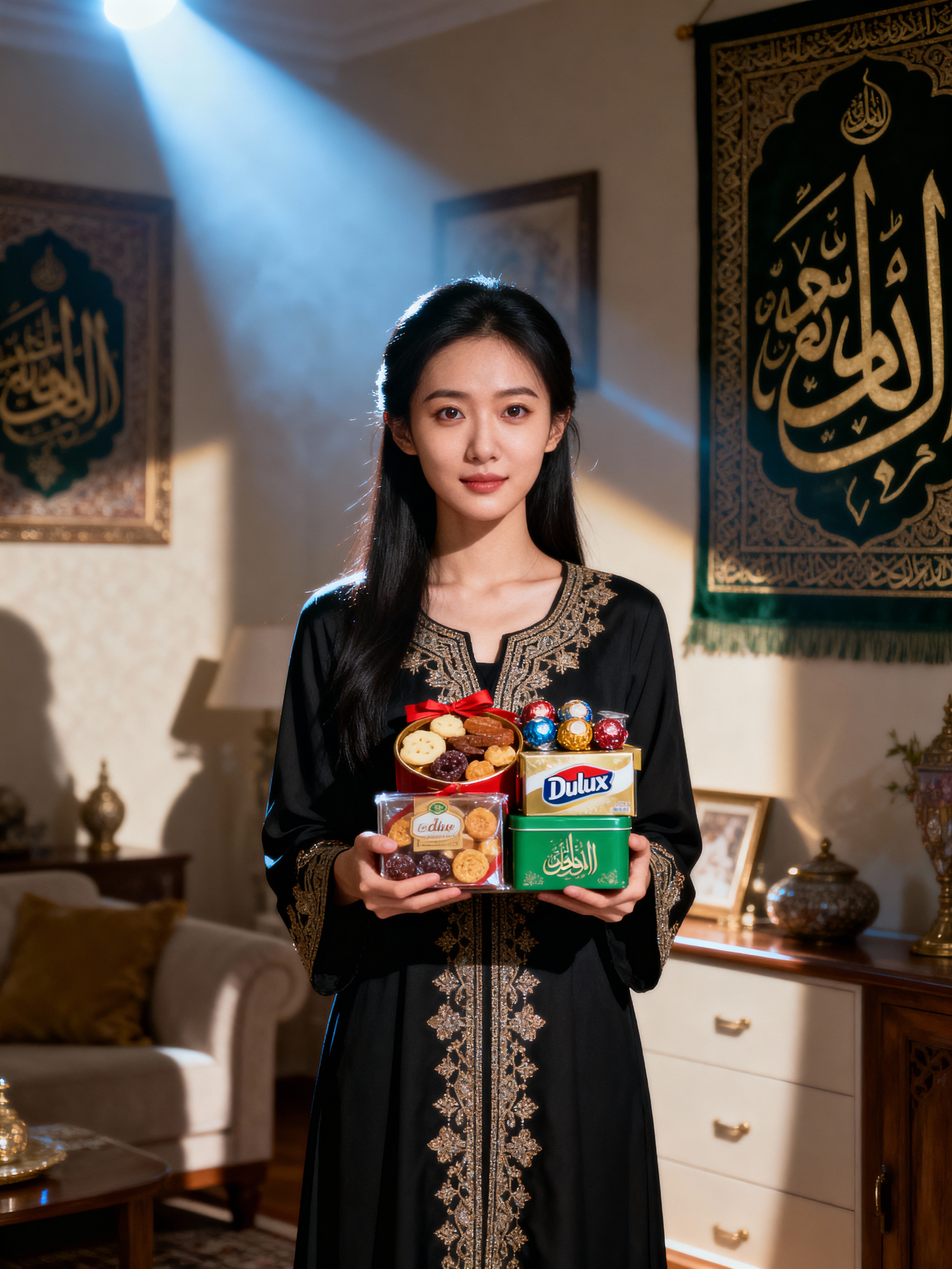 a model with hands holding Eid gifts and sweets , standing out in a beautifully decorated home with soft lighting and Islamic calligraphy