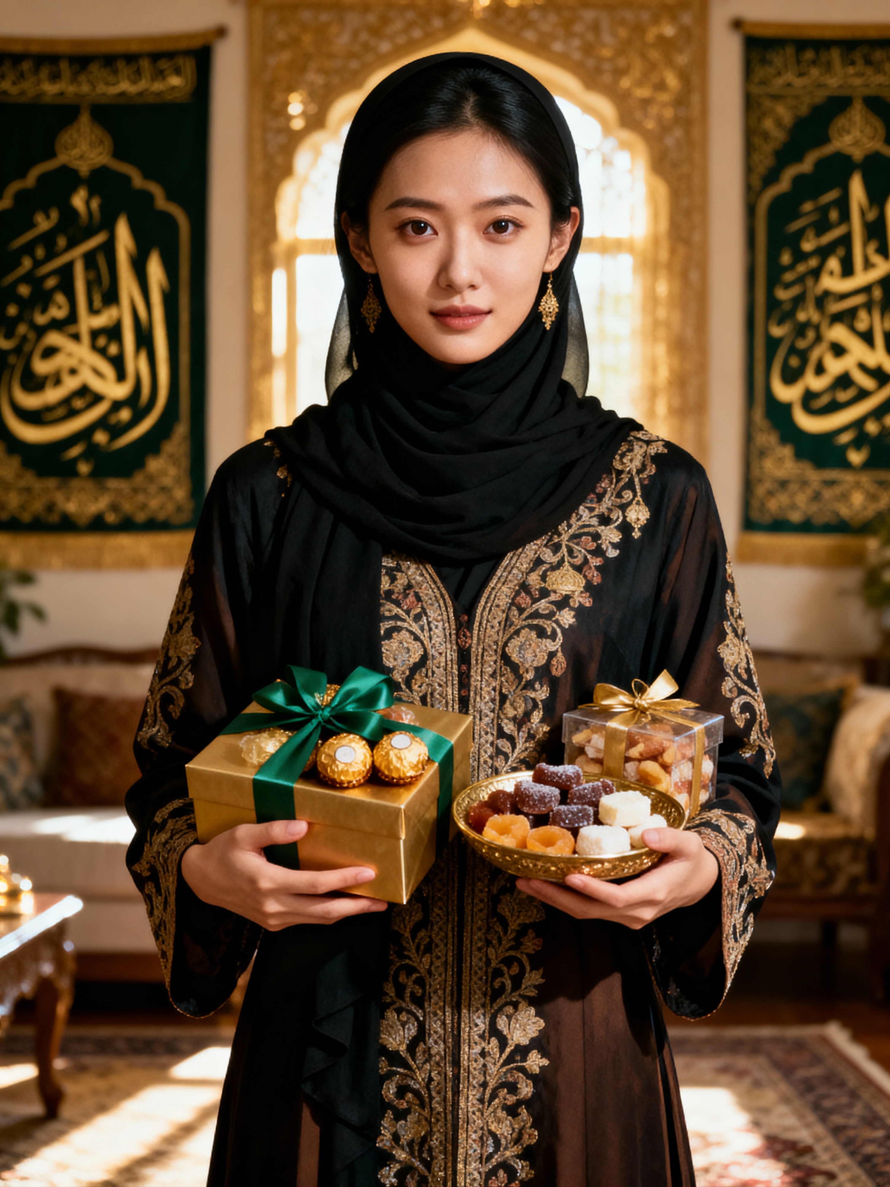 a model with hands holding Eid gifts and sweets , standing out in a beautifully decorated home with soft lighting and Islamic calligraphy