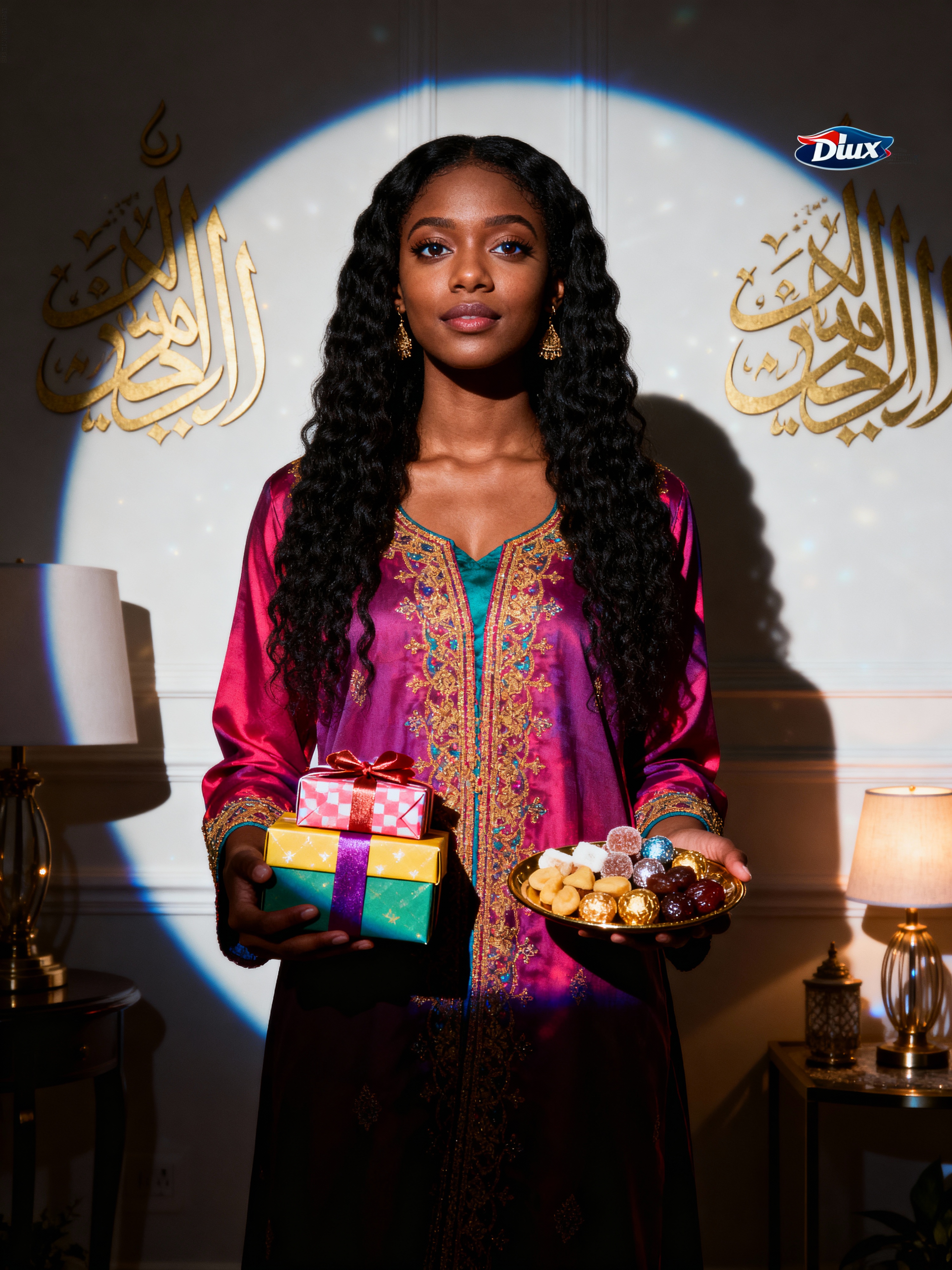 a model with hands holding Eid gifts and sweets , standing out in a beautifully decorated home with soft lighting and Islamic calligraphy