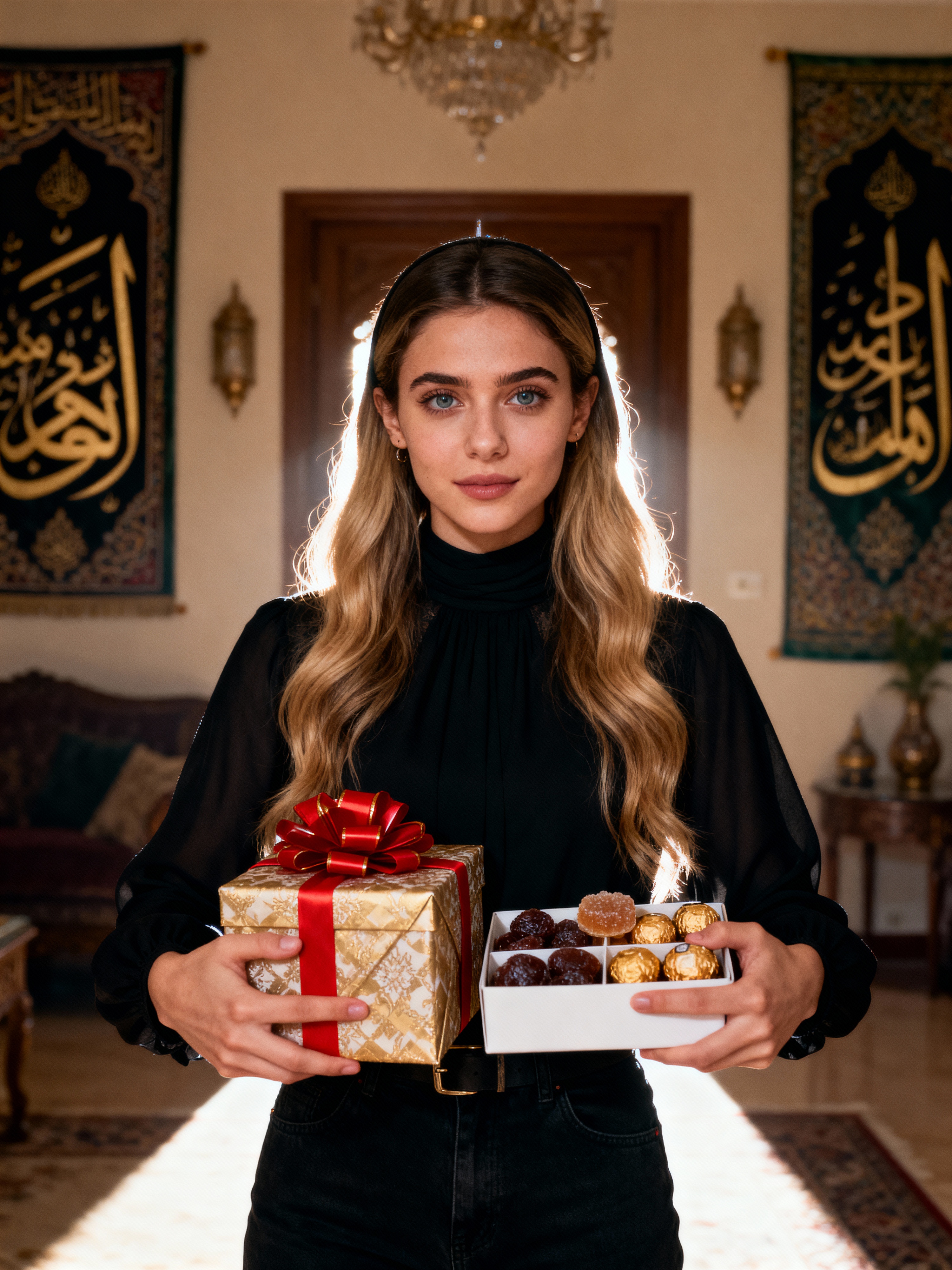 a model with hands holding Eid gifts and sweets , standing out in a beautifully decorated home with soft lighting and Islamic calligraphy