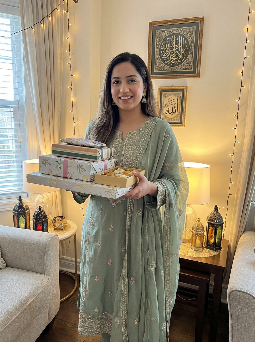 a model with hands holding Eid gifts and sweets , standing out in a beautifully decorated home with soft lighting and Islamic calligraphy