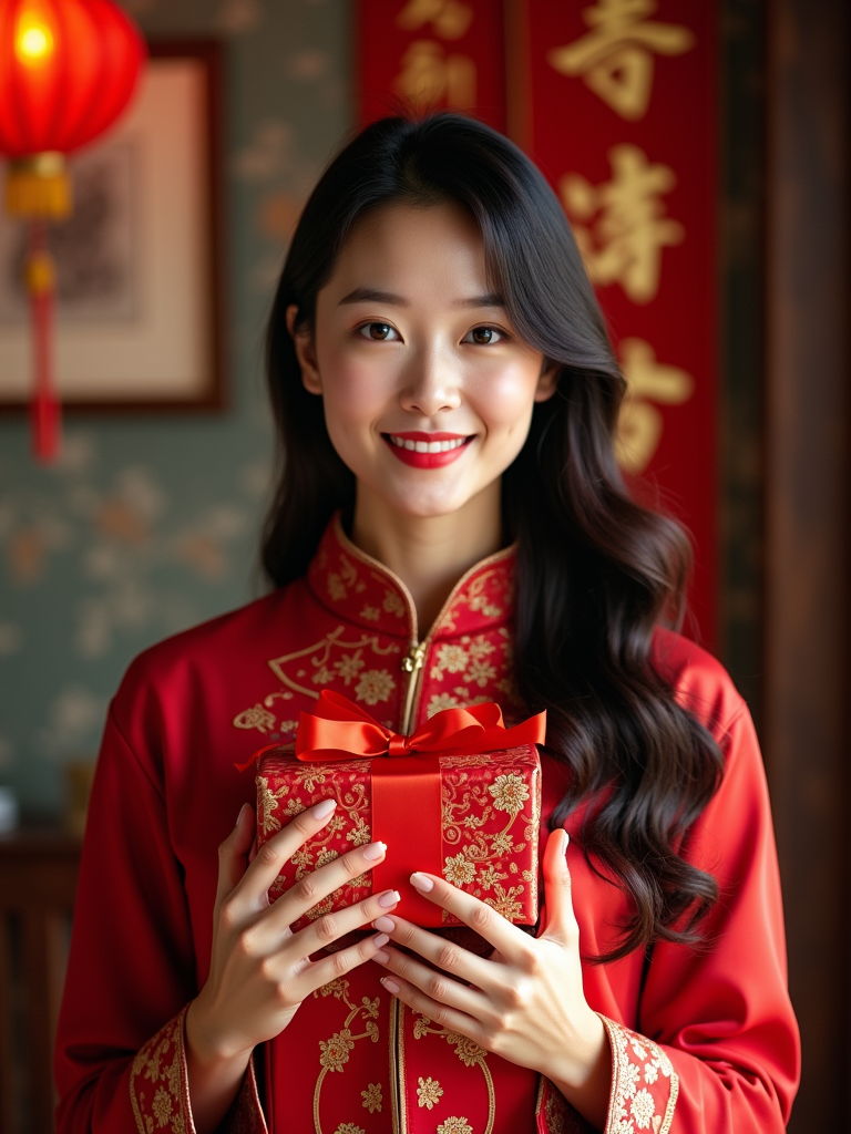 a model with hands holding traditional Chinese New Year gifts , standing out in a beautifully decorated home with red and gold ornaments and Chinese calligraphy