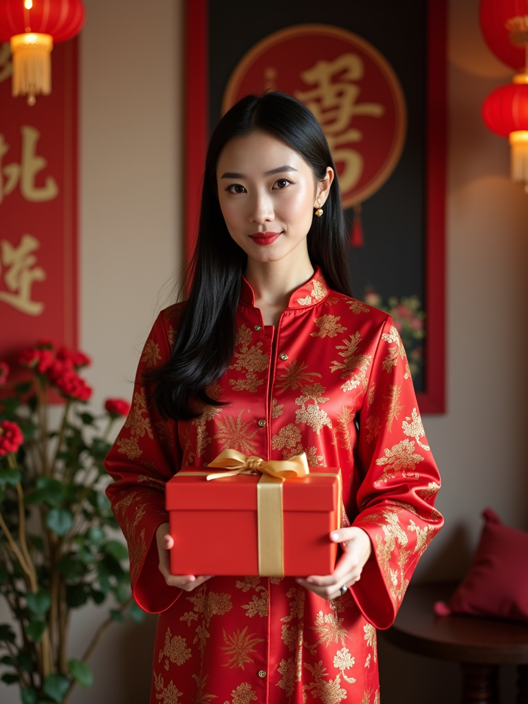 a model with hands holding traditional Chinese New Year gifts , standing out in a beautifully decorated home with red and gold ornaments and Chinese calligraphy