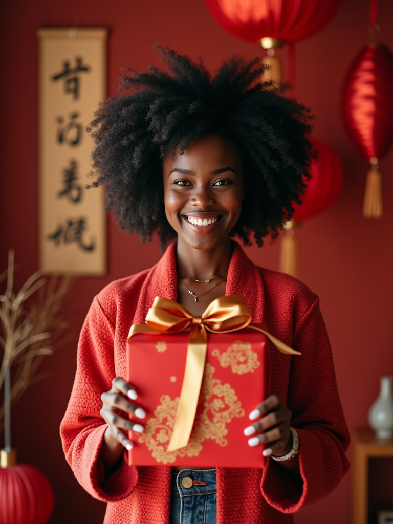 a model with hands holding traditional Chinese New Year gifts , standing out in a beautifully decorated home with red and gold ornaments and Chinese calligraphy