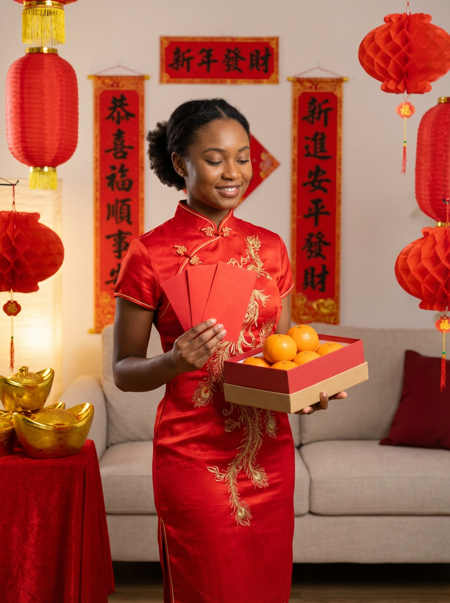 a model with hands holding traditional Chinese New Year gifts , standing out in a beautifully decorated home with red and gold ornaments and Chinese calligraphy