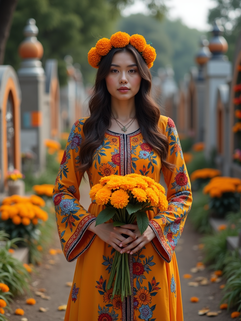 a model with hands holding traditional marigold flowers , standing out in a beautifully decorated cemetery with colorful graves and offerings