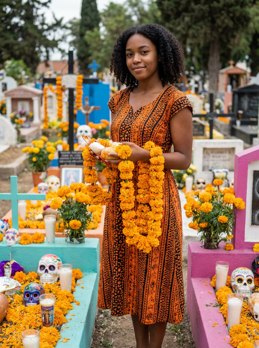 a model with hands holding traditional marigold flowers , standing out in a beautifully decorated cemetery with colorful graves and offerings