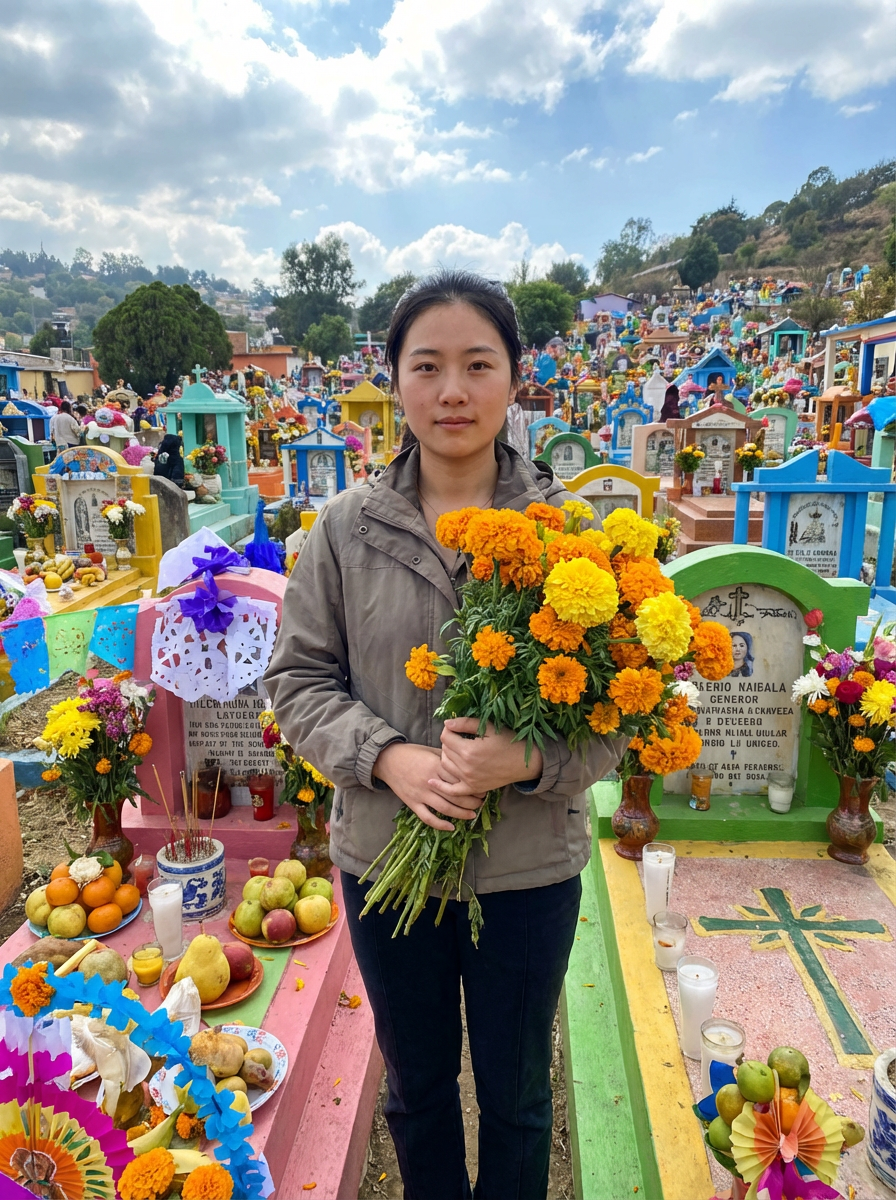 a model with hands holding traditional marigold flowers , standing out in a beautifully decorated cemetery with colorful graves and offerings