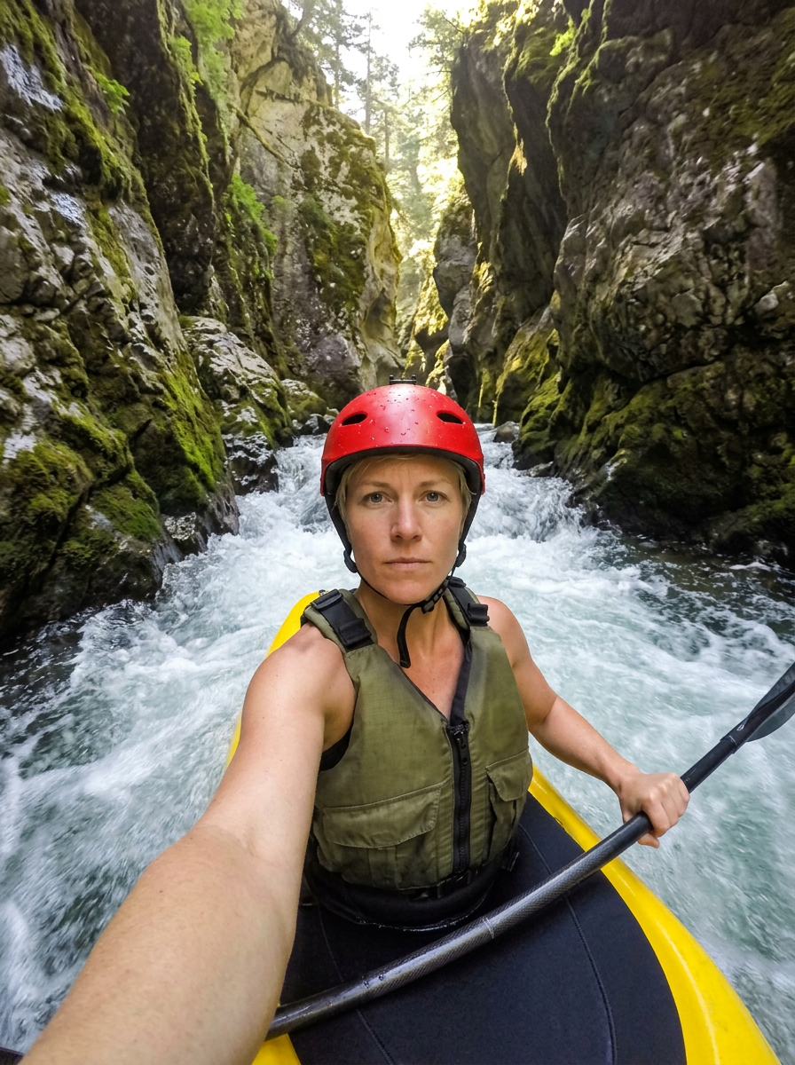 {"action":"generate","content":{"subject":{"description":"A close-up selfie of a determined athletic model with short blonde hair, wearing a red protective helmet and a rugged olive-green life vest with black straps.","pose":"The model is seated in a yellow kayak, holding a black paddle with a yellow blade in his right hand while taking a selfie with his left arm extended toward the camera."},"environment":{"setting":"A narrow, steep rocky canyon with dark, mossy cliff walls and lush green trees at the top peaks.","water_conditions":"Fast-moving white water rapids with churning foam and splashes hitting the side of the kayak."},"technical_details":{"camera_angle":"Low-angle wide-lens selfie perspective, creating a sense of immersion and speed.","lighting":"Bright, natural sunlight filtering down from the top of the gorge, creating high-contrast shadows on the rocks and sparkling highlights on the water.","style":"Hyper-realistic action photography with a shallow depth of field, focusing sharply on the model's intense expression while the background rapids have a slight motion blur."},"color_palette":["Vibrant yellow kayak and paddle","Deep red helmet","Natural mossy greens and dark grey rock","Crisp white water foam"]}}