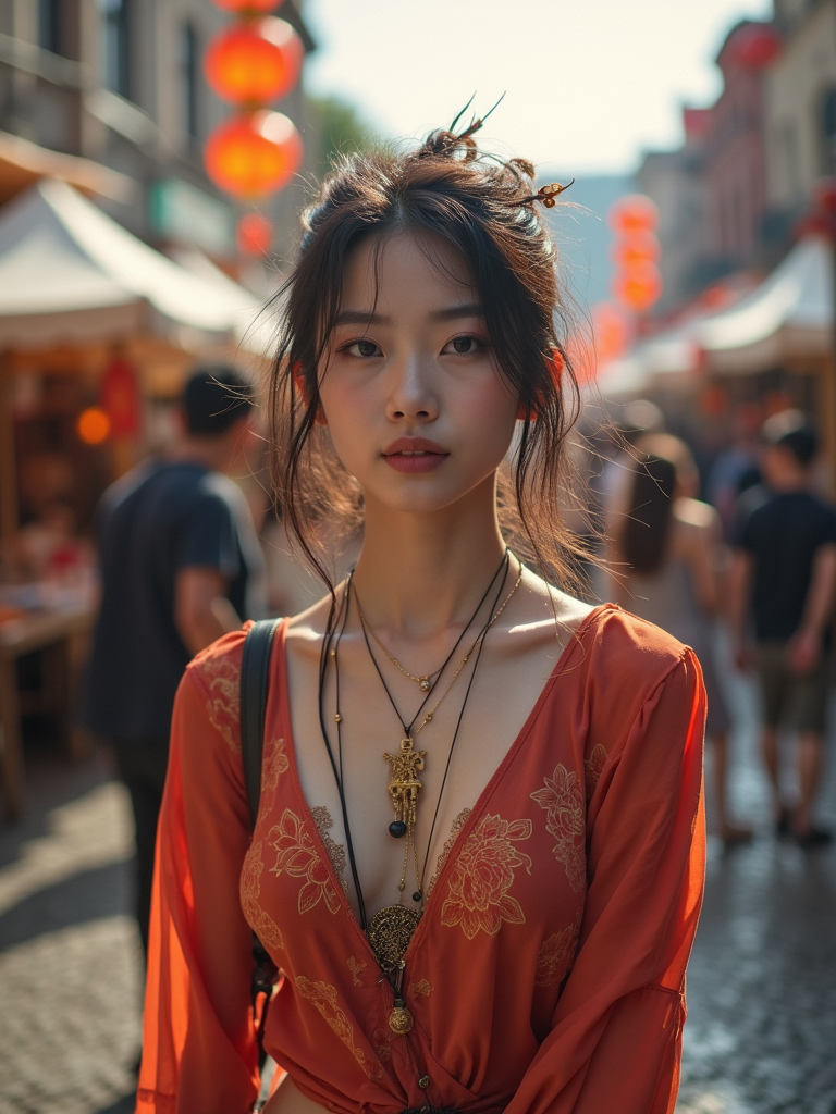 adventurous feminine model exploring a local street festival or art fair