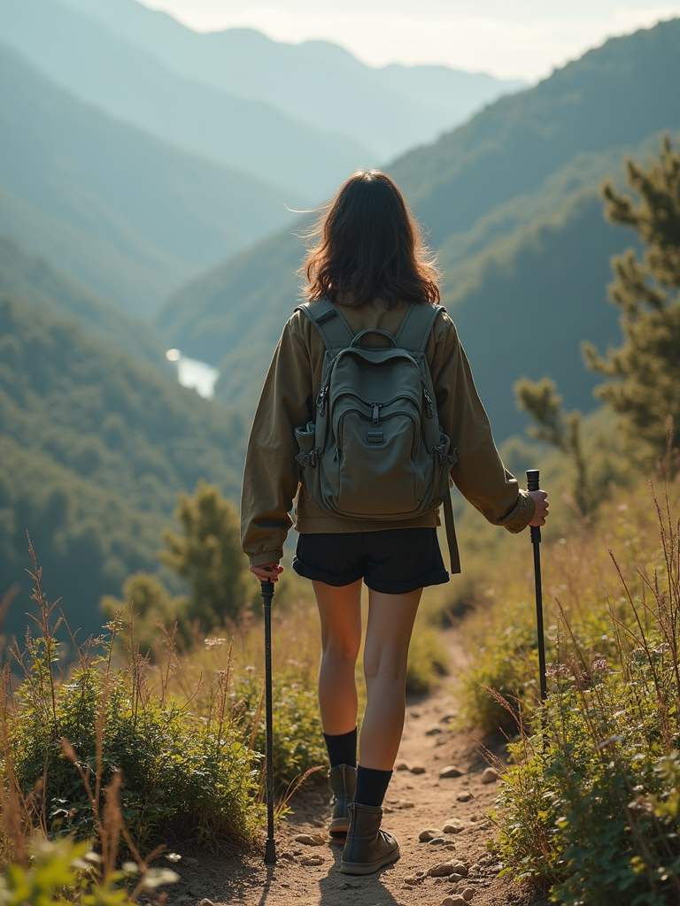 adventurous feminine model exploring a scenic hiking trail