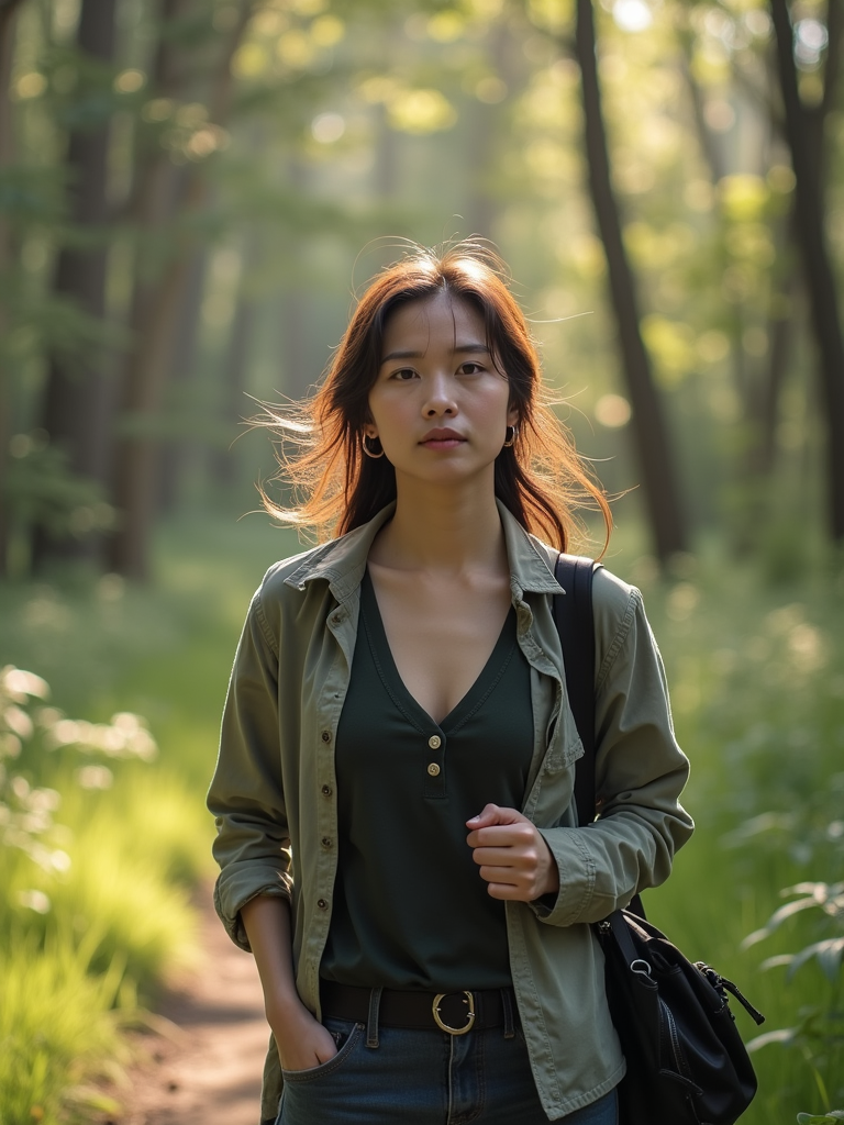 adventurous feminine model taking a casual hike in a nearby nature trail