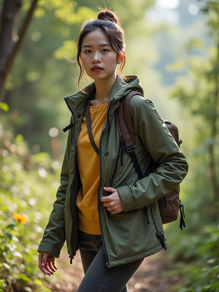 adventurous feminine model taking a casual hike in a nearby nature trail
