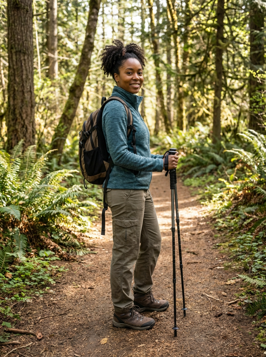 adventurous feminine model taking a casual hike in a nearby nature trail