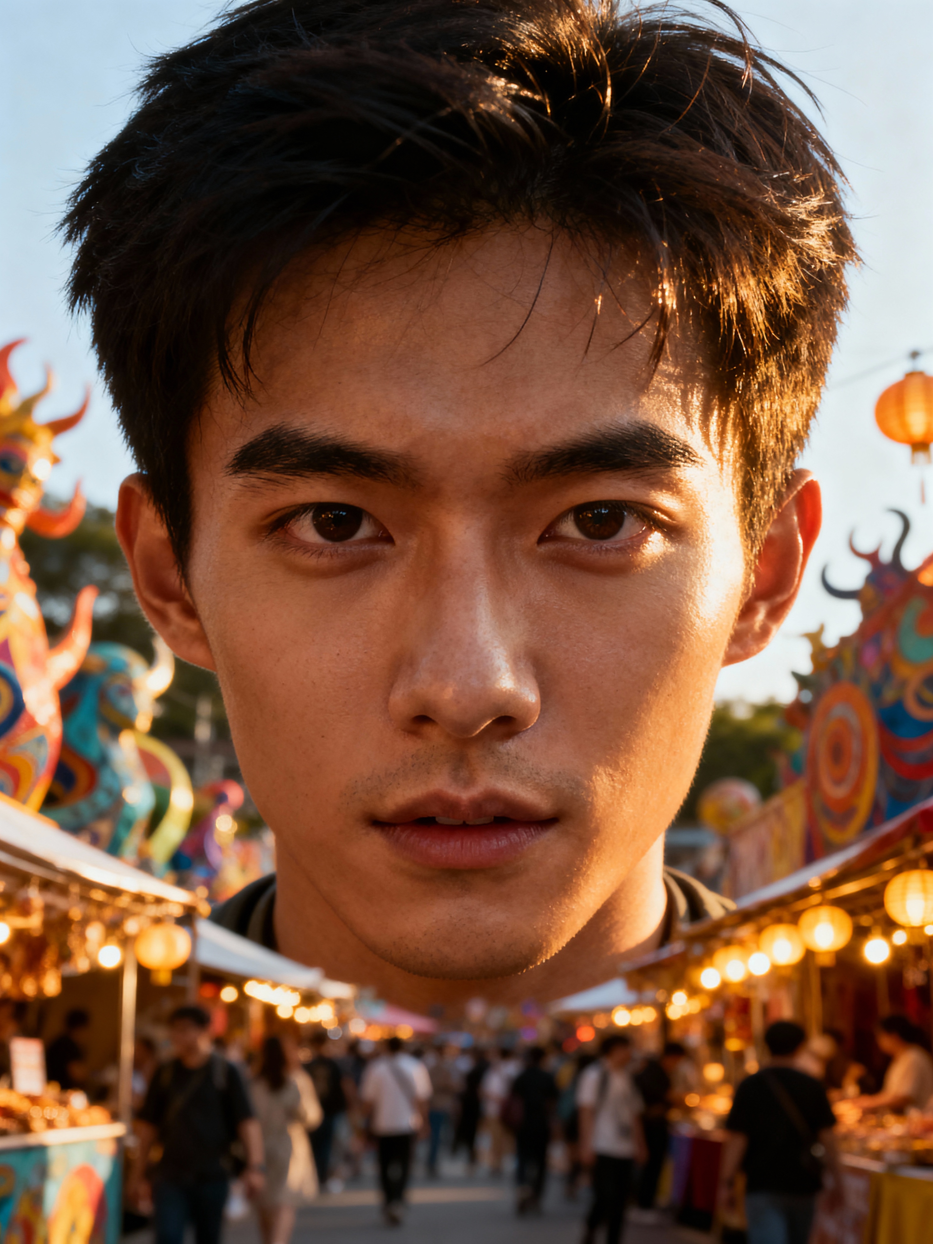 adventurous masculine model exploring a local street festival or art fair