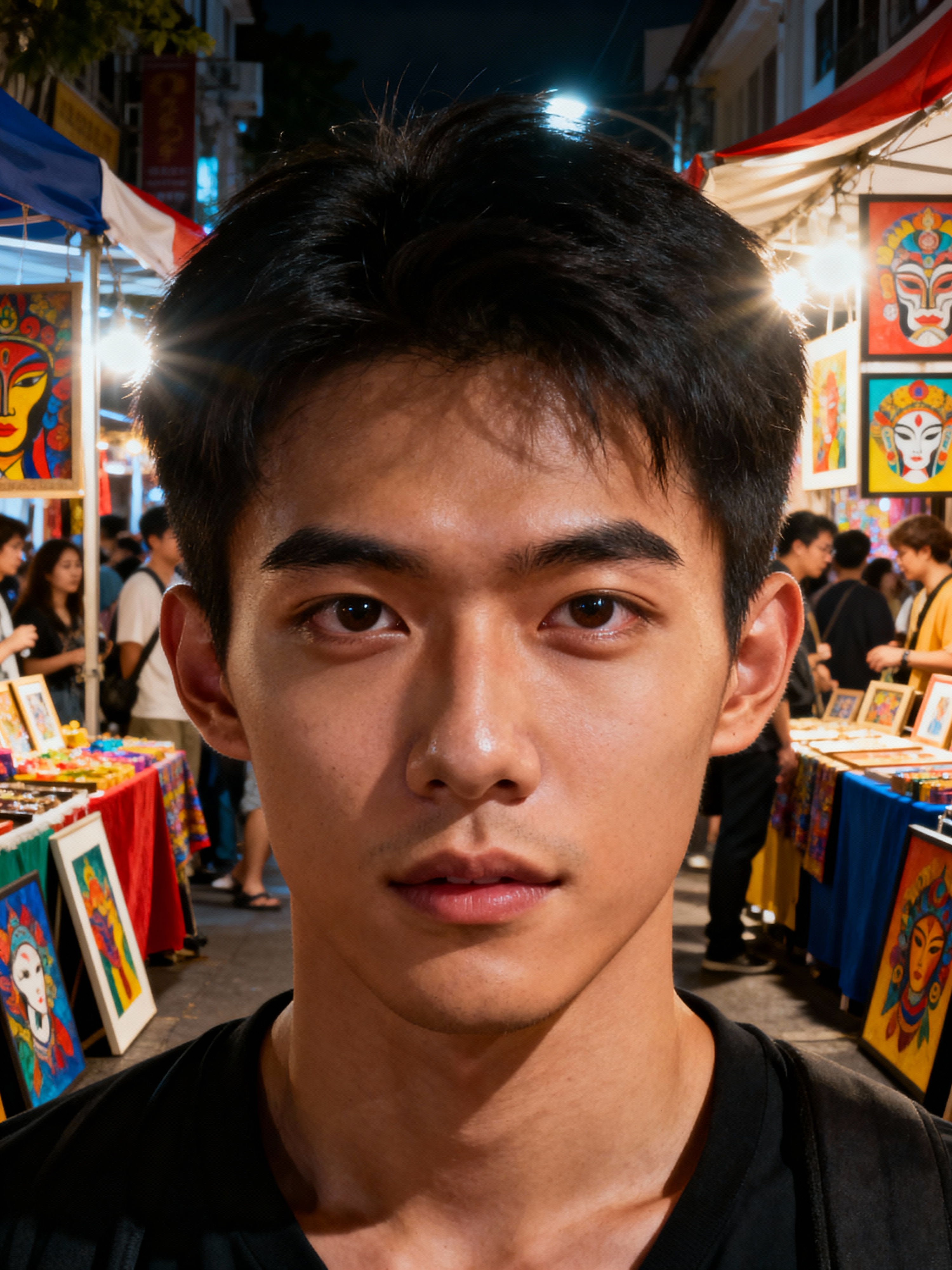 adventurous masculine model exploring a local street festival or art fair