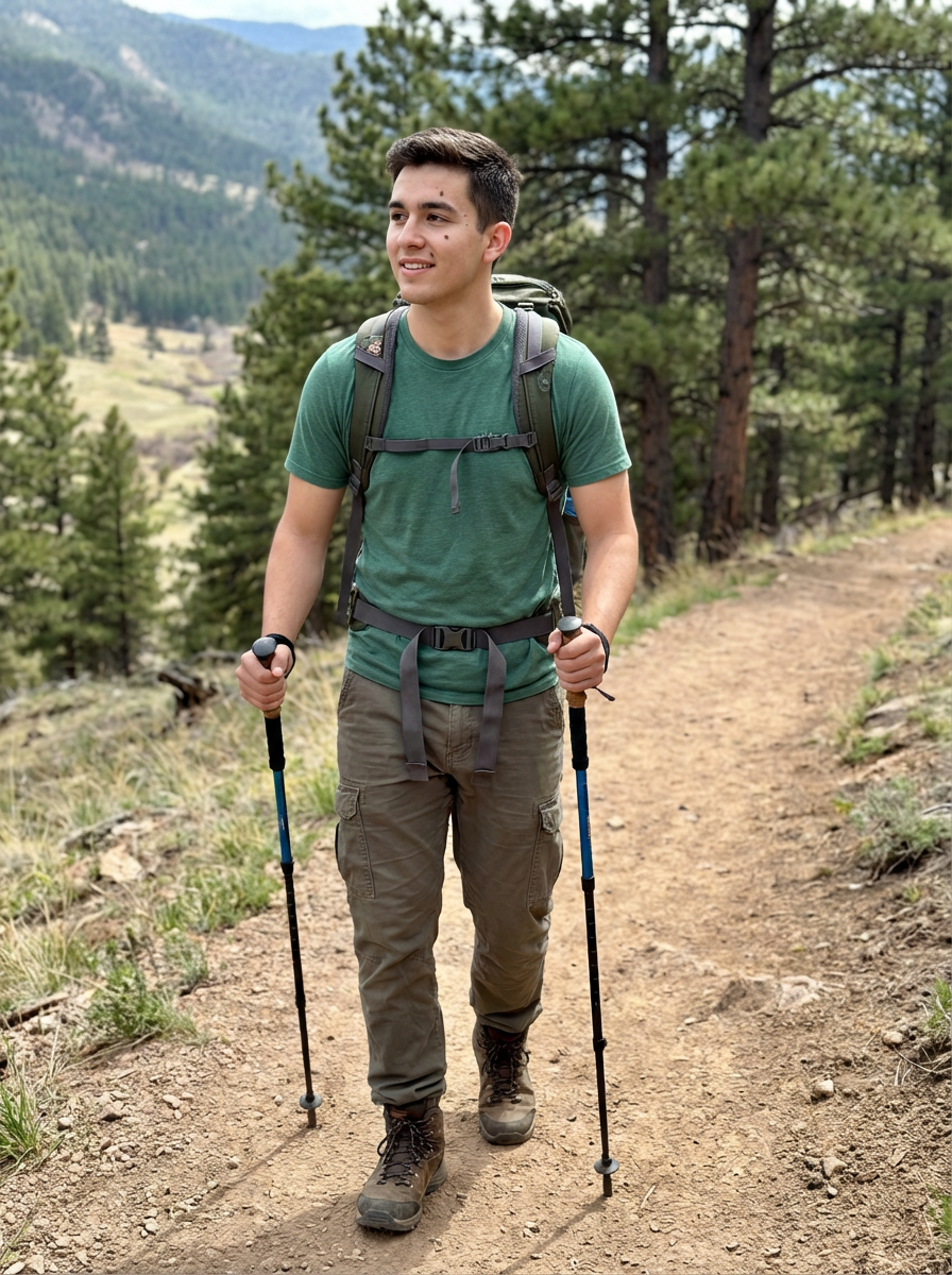 adventurous masculine model exploring a scenic hiking trail
