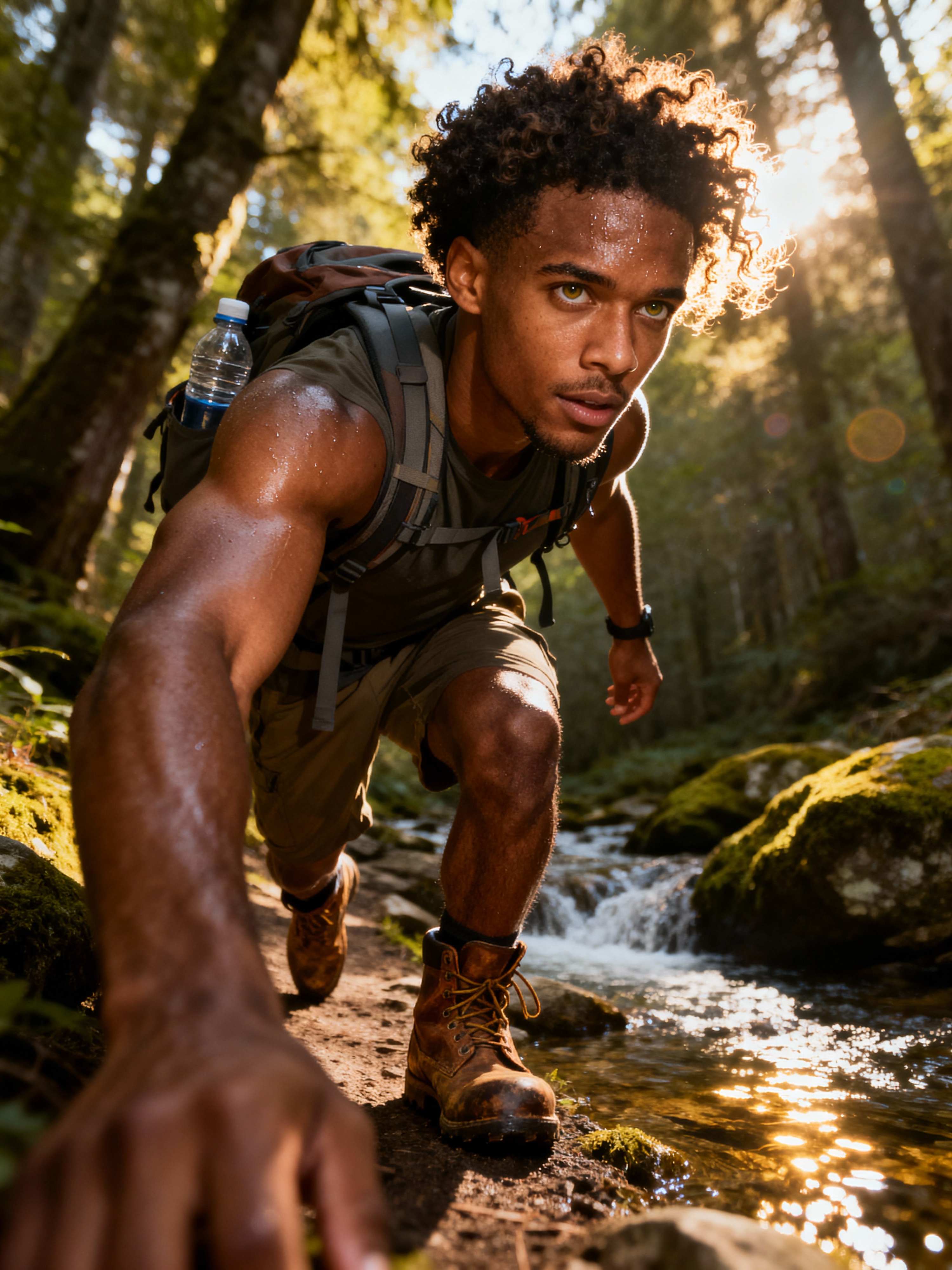 adventurous masculine model taking a casual hike in a nearby nature trail