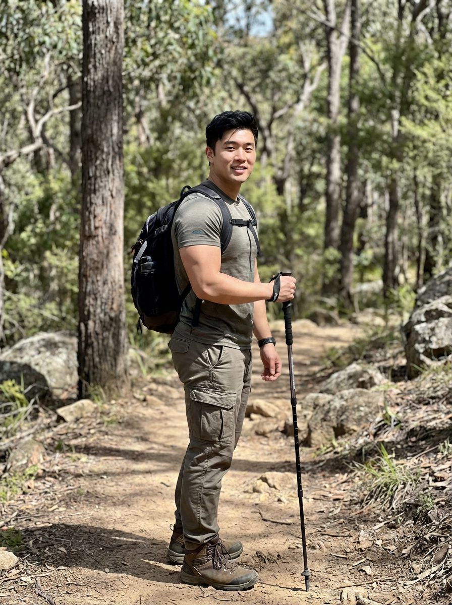 adventurous masculine model taking a casual hike in a nearby nature trail