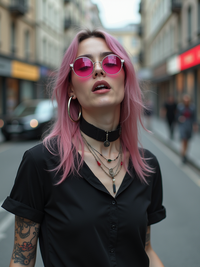 Alternative fashion, edgy attitude, street photography vibes. Pink-tinted glasses, dark choker, expressive pose . TikTok and Instagram style.